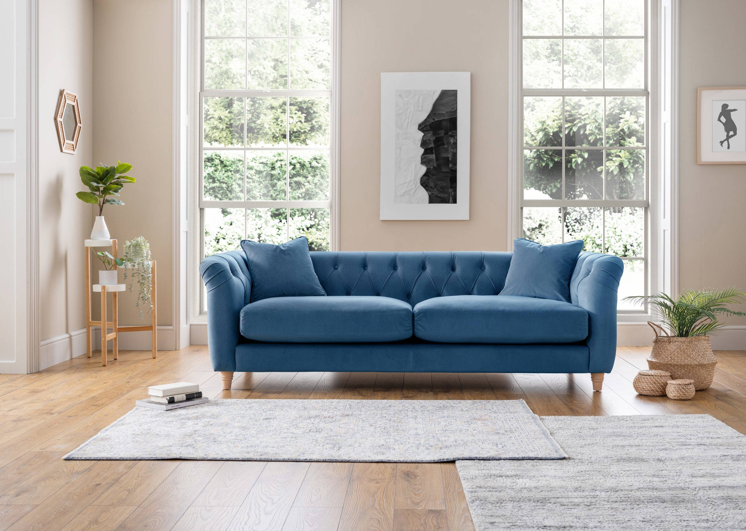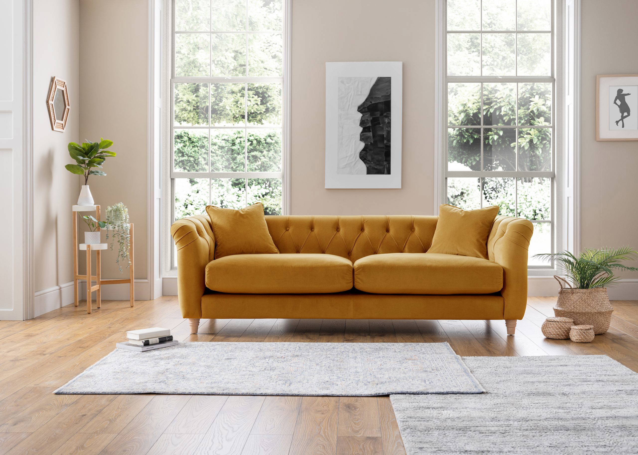 A plump and sumptuos sofa range. Deep hand buttoning and thick contemporary soft padded arms. Fully reversible seat cushion crafted with an interior core of pocket springs topped off with a blend of feathers and fibres. Soft touch crush resistant velvet in a range of contemporary fashion colours